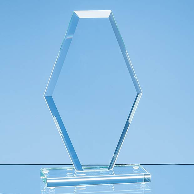 The stylish facet clipped diamond award is crafted out of 1cm thick jade glass and is mounted on a rectangular base. It is an elegant design that can be personalised with any logo, crest or wording and presented as an achievement award or gift. The award is also available in 20cm and 24cm.