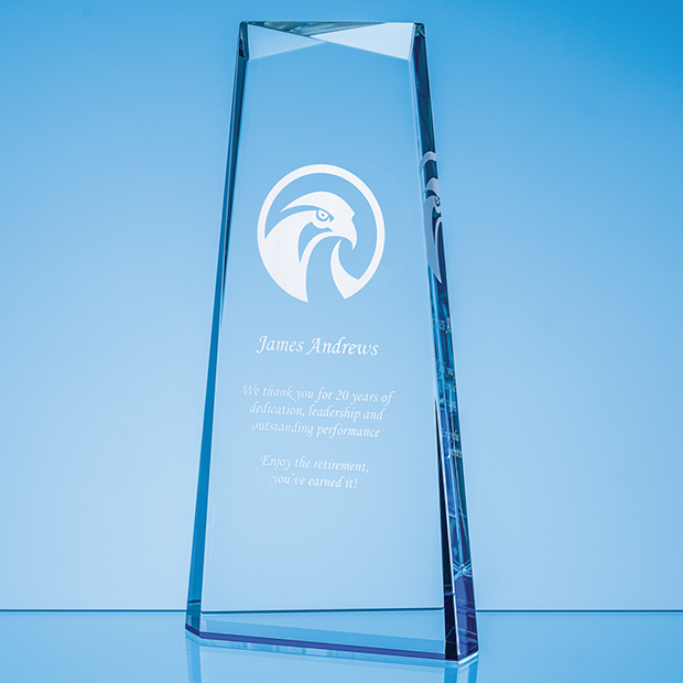 Impressive contemporary and tapered this award in flawless optical crystal features angular sides and a faceted detail on the top making it a highly popular piece. Available in three sizes 15cm 19cm and 23cm shown it is ideal to use as a standalone presentation recognition or award but 1st 2nd and 3rd place achievement whether sporting academic or corporate. With a generous area to engrave a crest company logo or message it comes in its own foam lined presentation box.