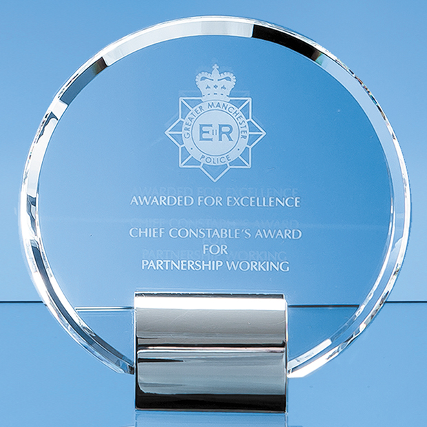 Elegant and very effective, the 17.5cm Circle Award is made out of perfectly clear optical crystal and mounted onto a chrome plated base to create an exquisite recognition, achievement or incentive gift. It can be personalised with any crest, logo or wording to create an award that is sure to take pride of place when put on display at home or at work. It is supplied in a black foam lined presentation box.