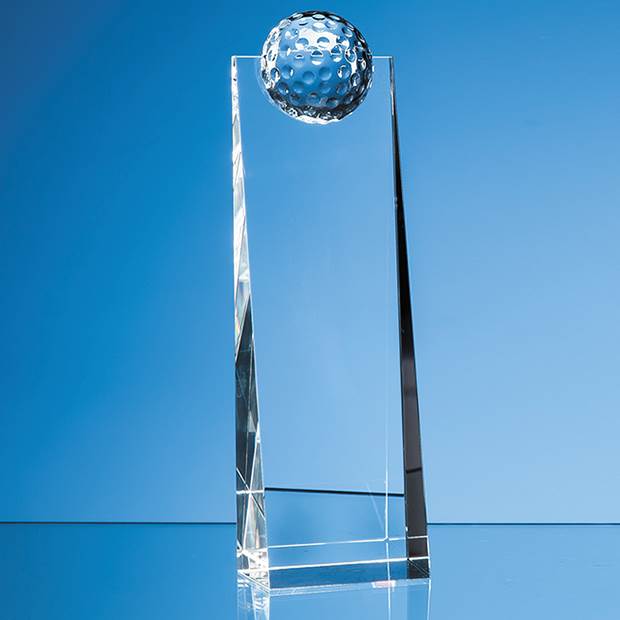 The modern looking 24cm Golf Ball Rectangle award is hand crafted out of perfectly clear optical crystal. The rectangle benefits from a large engraving area that can be personalised with any crest, logo or wording to create an award that is sure to take pride of place when put on display at home or at work. It is an ideal recognition, achievement or incentive gifts and is supplied in a black foam lined presentation box.