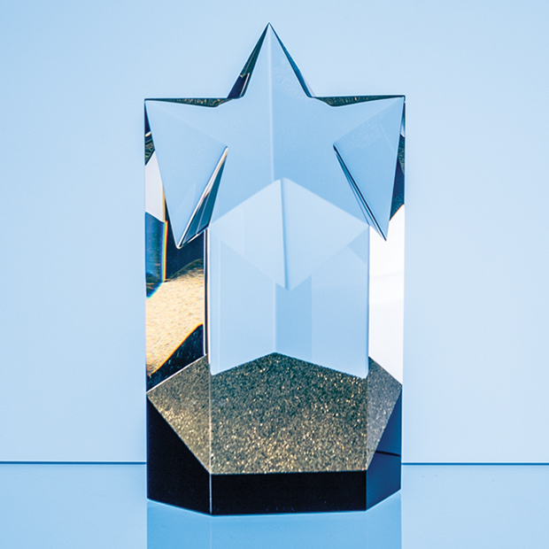 The 16cm Sparkling Gold Optical Crystal Star Column Award is an exquisite embodiment of distinction and achievement, thoughtfully crafted to honour excellence with an undeniable touch of glamour. The award features a sparkling gold layer that is encapsulated between the onyx black base and optical crystal star column. The award can be engraved on the top of the star and also on the front face of the column. It is supplied in a foam lined gift box.