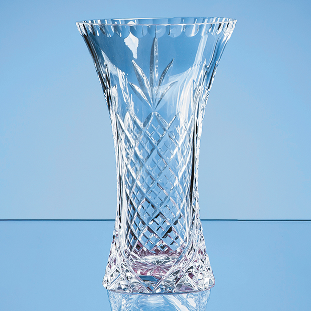 The flower fades that is not looked upon, the old maxim goes. So make sure you gaze often on flowers in this stunning 23cm lead crystal panelled flared vase. Beautifully embellished with a hand cut diamond design with a blank panel that can be engraved with a special message, logo or crest to create a gift that is sure to be treasured by the recipient. The vase is supplied in an individual cardboard box but can be upgraded to a satin lined presentation box for that extra special touch.