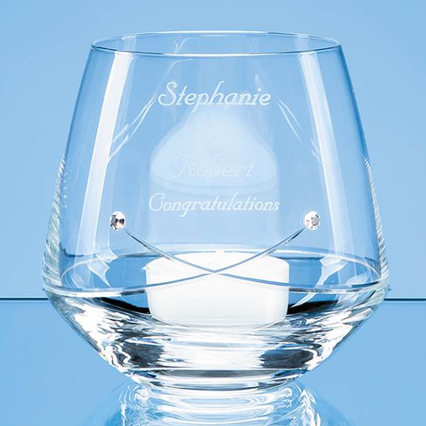 It started with a kiss or maybe with a gift of this romantic 9cm crystal tealight holder. With delicate hand cut swirls which cross in an X shaped Kiss and sprinkled with sparkling Swarovski Diamante crystals and with space to engrave an inscription or message it would make a great work leaving gift or present for someone special in your life. The tealight holder is supplied in an attractive GIft Box. Note the candle is for illustration purposes only.