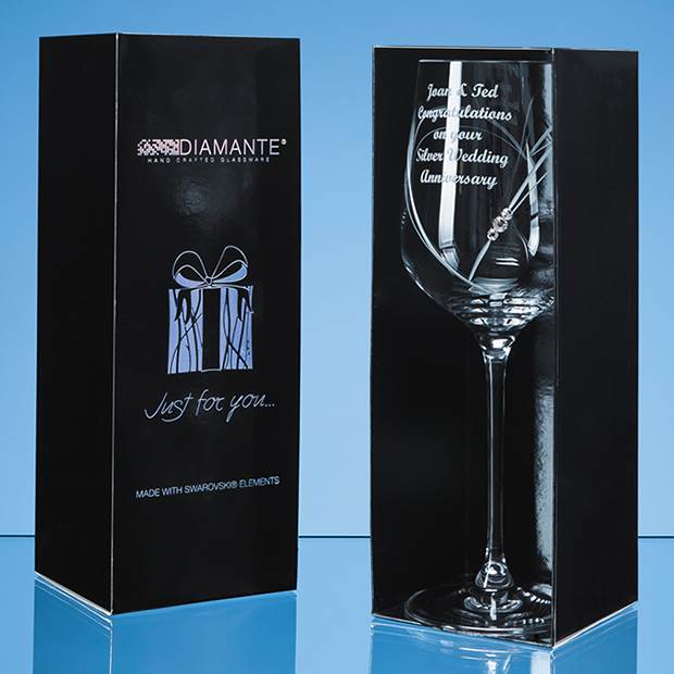 Slender sophisticated understated. This elegant contemporary Just for you wine glass is hand cut with a stylised heart shaped design and sprinkled with three sparkling Swarovski Diamante crystals. There is a generous space to engrave a logo crest dedication or inscription making it ideal as a personal or corporate gift or memento. Plus it is packaged in a beautiful designer presentation box.
