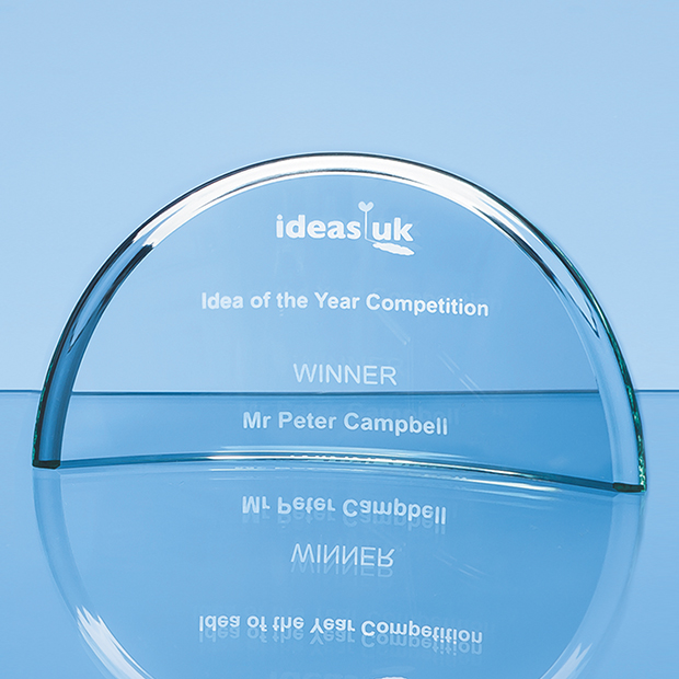 The stylish jade glass half moon crescents are available in 3 sizes and make ideal recognition awards to put on display at work or at home. They have a polished bevelled edge on the curved part of the crescent and a large engraving area that can be personalised with any logo, crest and wording to mark a sales achievement, sporting success or just to acknowledge a job well done.