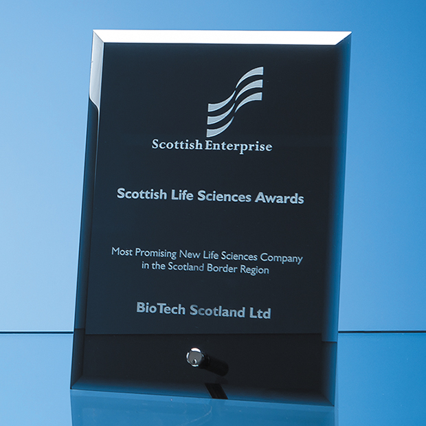This deluxe 18cm x 12.5cm smoked black glass plaque is perfect to recognise an achievement at work or as a special award. Highly polished with smooth bevelled edges there is a chrome standing pin so that it can be displayed on a shelf or desk. There is a generous engraving space to include a logo dedication or inscription which will have additional stand-out if embellished with silver or gold pigment please ask about this when ordering.