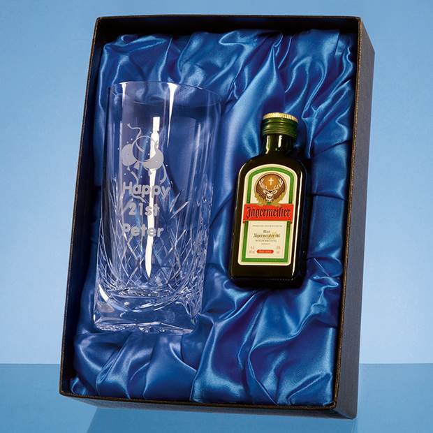 The Blenheim Lead Crystal high ball glass is a traditional design with diamond cut detail. It has an area that can be engraved with any wording, logo or crest. The glass and miniature bottle of Jagermeister come in a satin lined presentation box making it an ideal personal gift that will be treasured and enjoyed by the recipient.