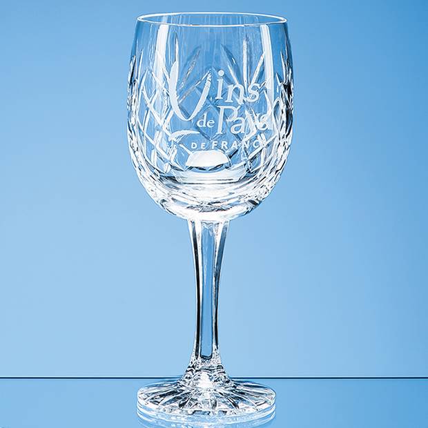 Has someone you know got a penchant for a cheeky glass of white from time to time This stunning 285ml Glencoe lead crystal panel goblet is perfect for a cool glass of wine. It incorporates a classic diamond and wedge cut pattern and has space for engraving your chosen logo crest or message. It would be a stylish and sophisticated memento or gift for any occasion such as a work farewell engagement birthday or anniversary. Available as an option is a beautiful presentation box with blue satin lining.